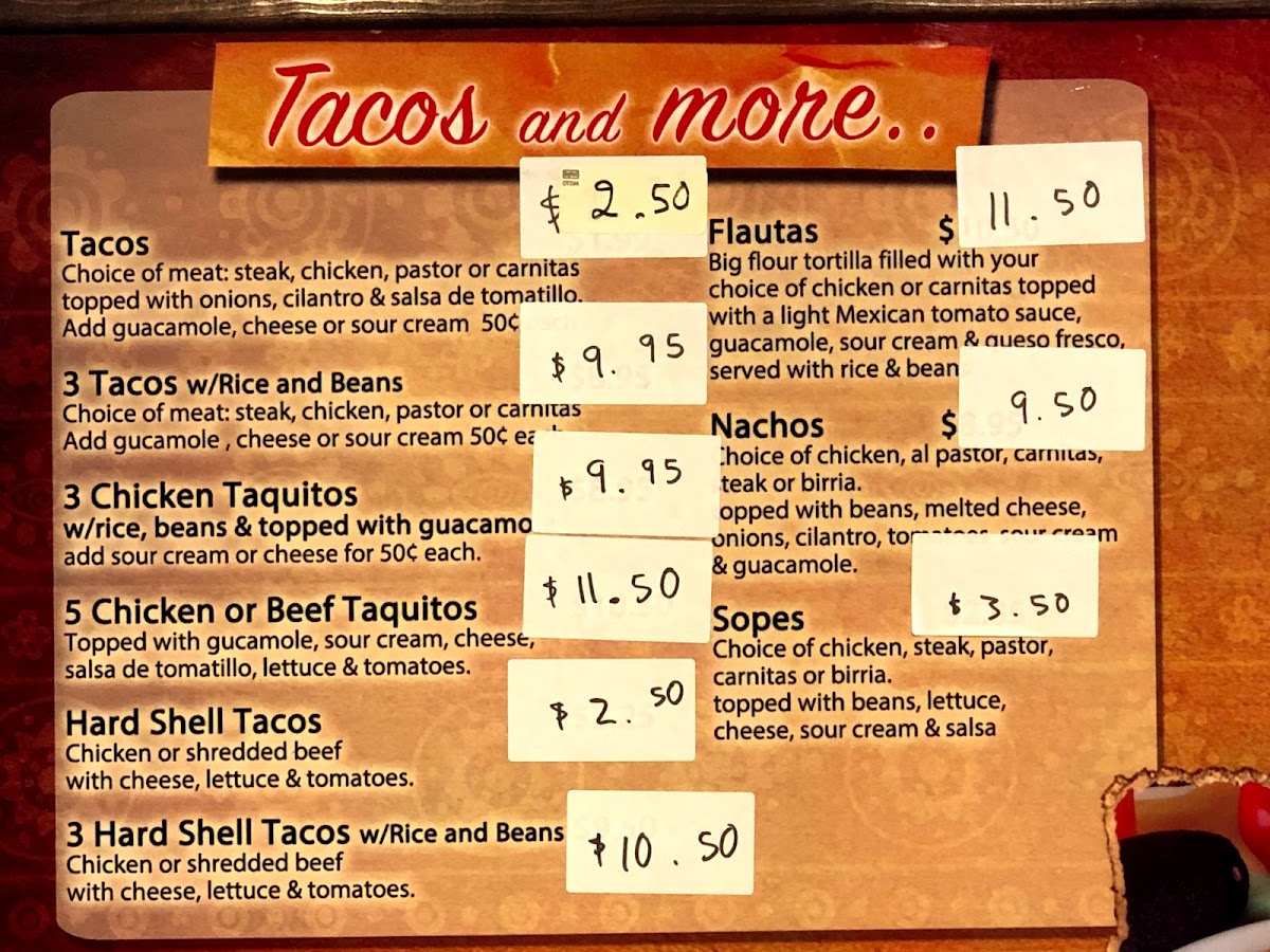 tacos asada, pastor, chicken, birria, carnitas. enchilada cheese, beef, chicken.